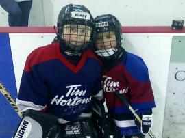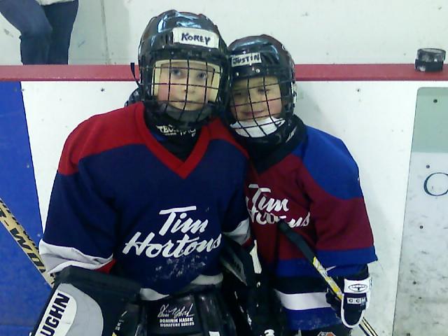 Last Saturday, Justin had his regular 8:30 am practice and Korey had a game at 10:30. Korey was dressed early so Justin and I went for hot chocolate. We entered the rink just after the game started and Justin said, “Mommy, Korey’s team has two goalies.”